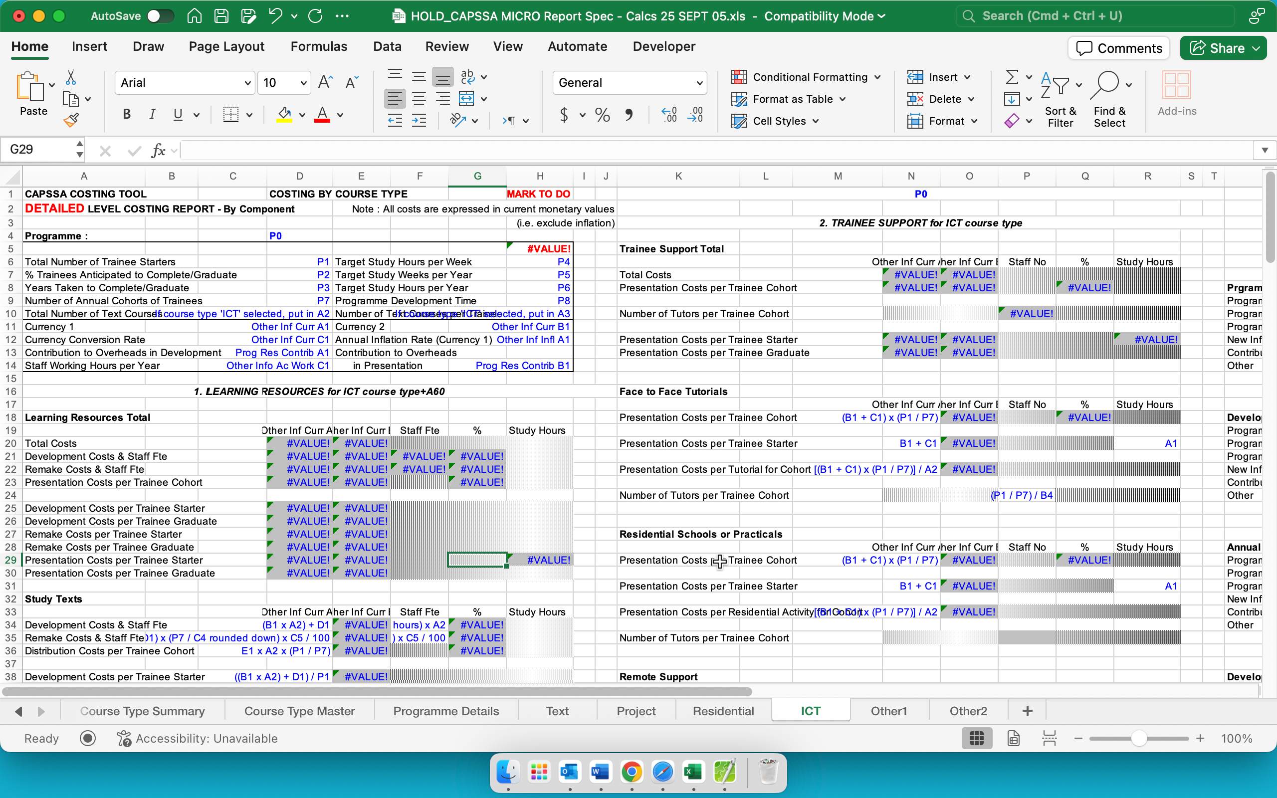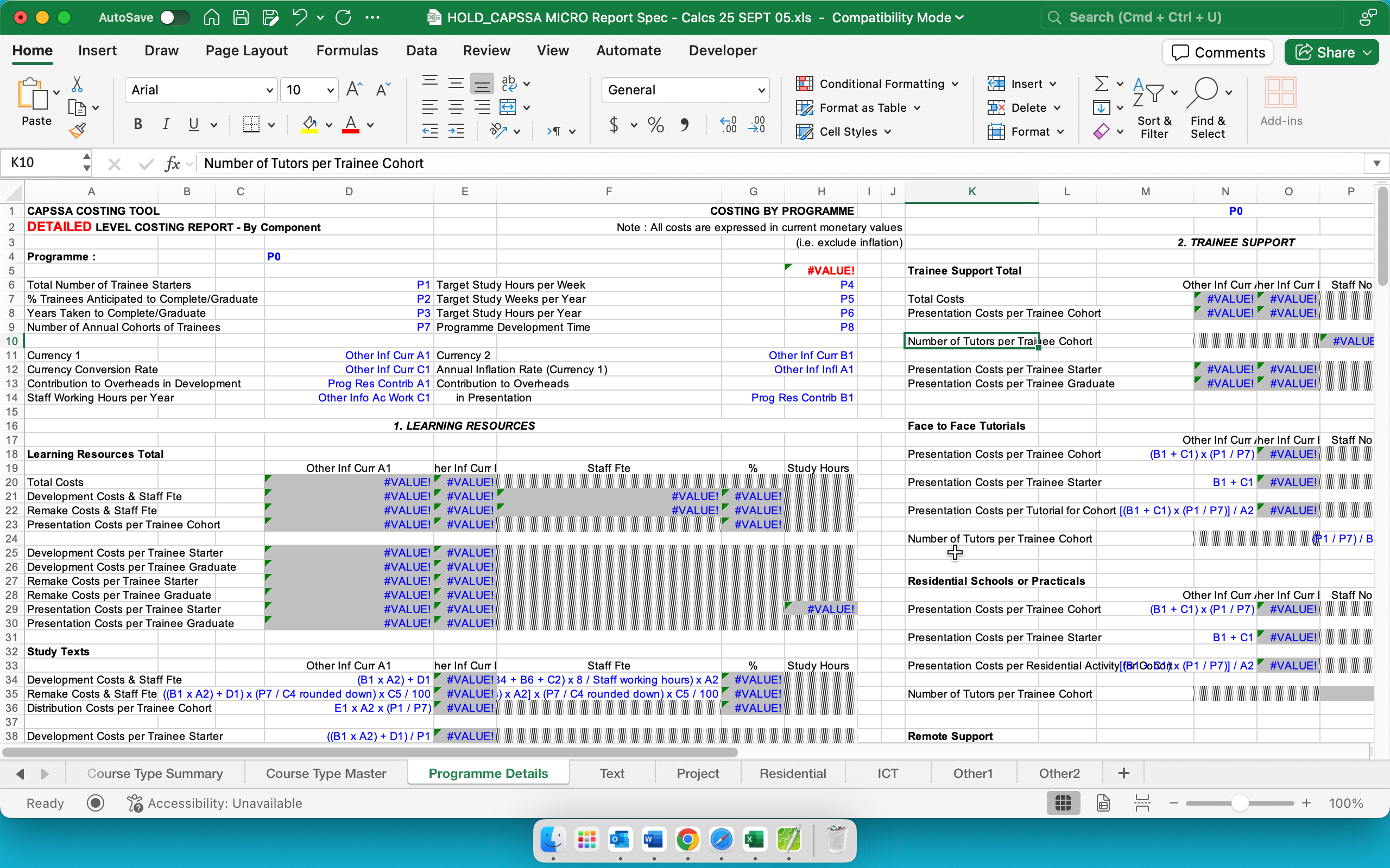 This spreadsheet template is a structured costing and reporting workbook designed to calculate and present the full costs of training/education programmes at a detailed level. It captures core programme assumptions (e.g., trainee numbers, completion rates, study hours/weeks, cohorts, development time, currencies and inflation parameters), then translates them into consolidated outputs such as total programme costs and income, unit costs per trainee starter/graduate, and component-level cost analysis.