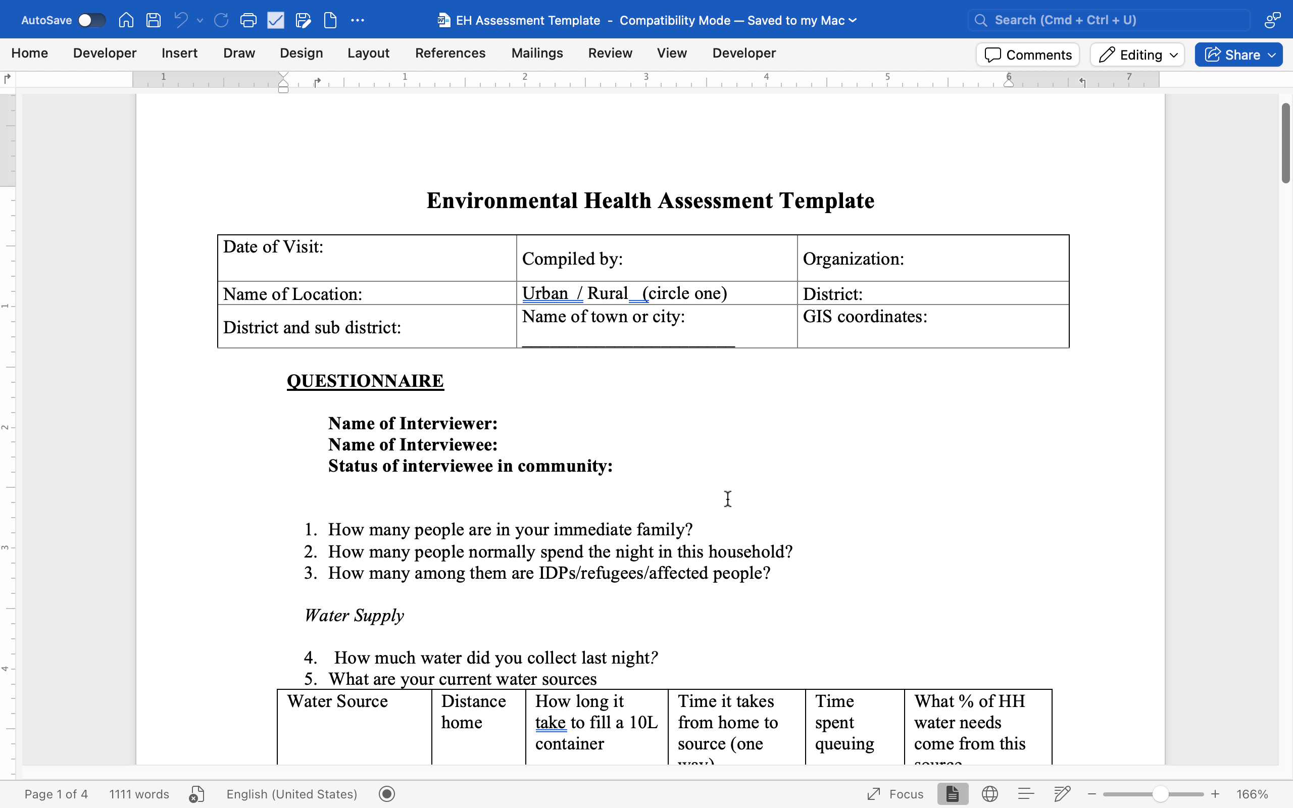 This template is a structured Environmental Health (EH) assessment questionnaire developed by the International Rescue Committee to support rapid field assessments at household and community level. It starts with basic visit/location metadata (date, compiler, organization, location type, district, and GIS coordinates) and interviewer/interviewee details, then collects key household characteristics (household size and whether members include IDPs/refugees/affected people).
