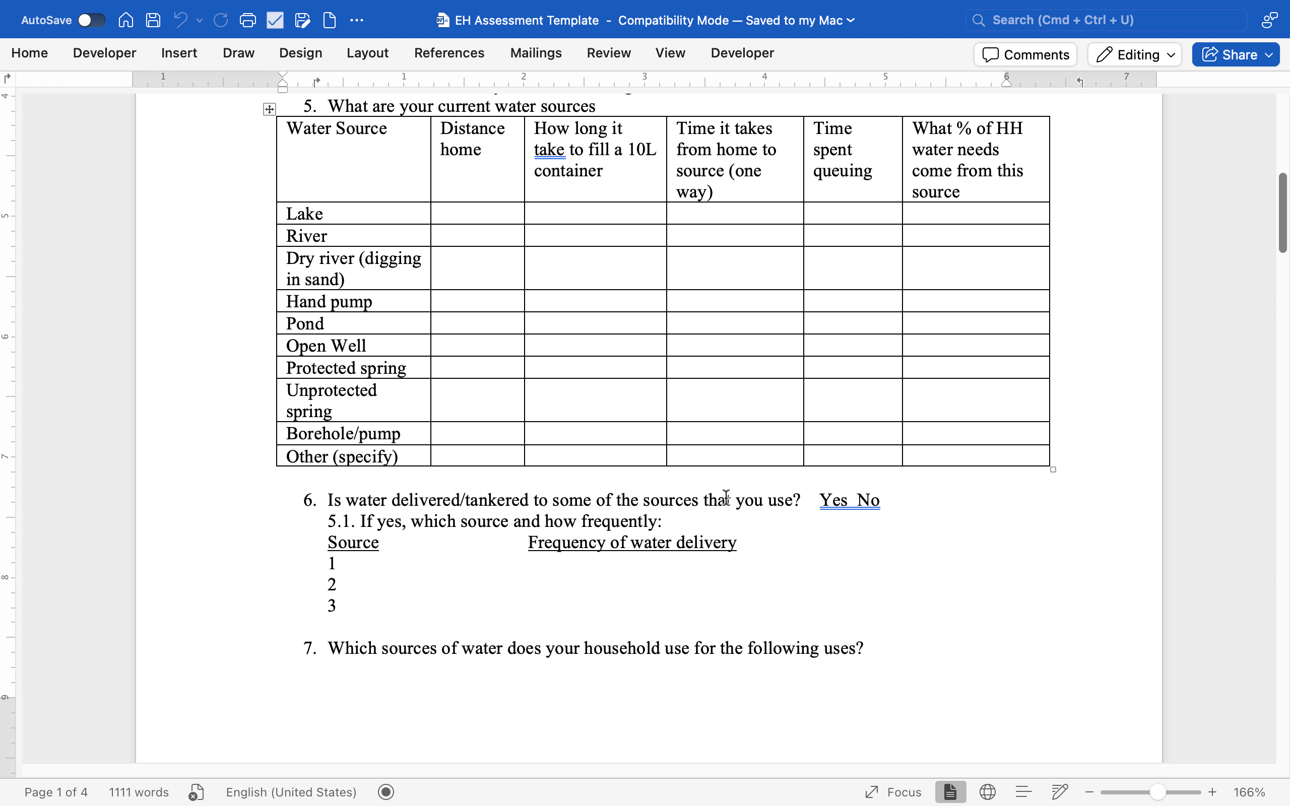 4. Water Supply (quantity collected, sources, access/time, delivery, uses, obstacles, storage, payment, treatment)