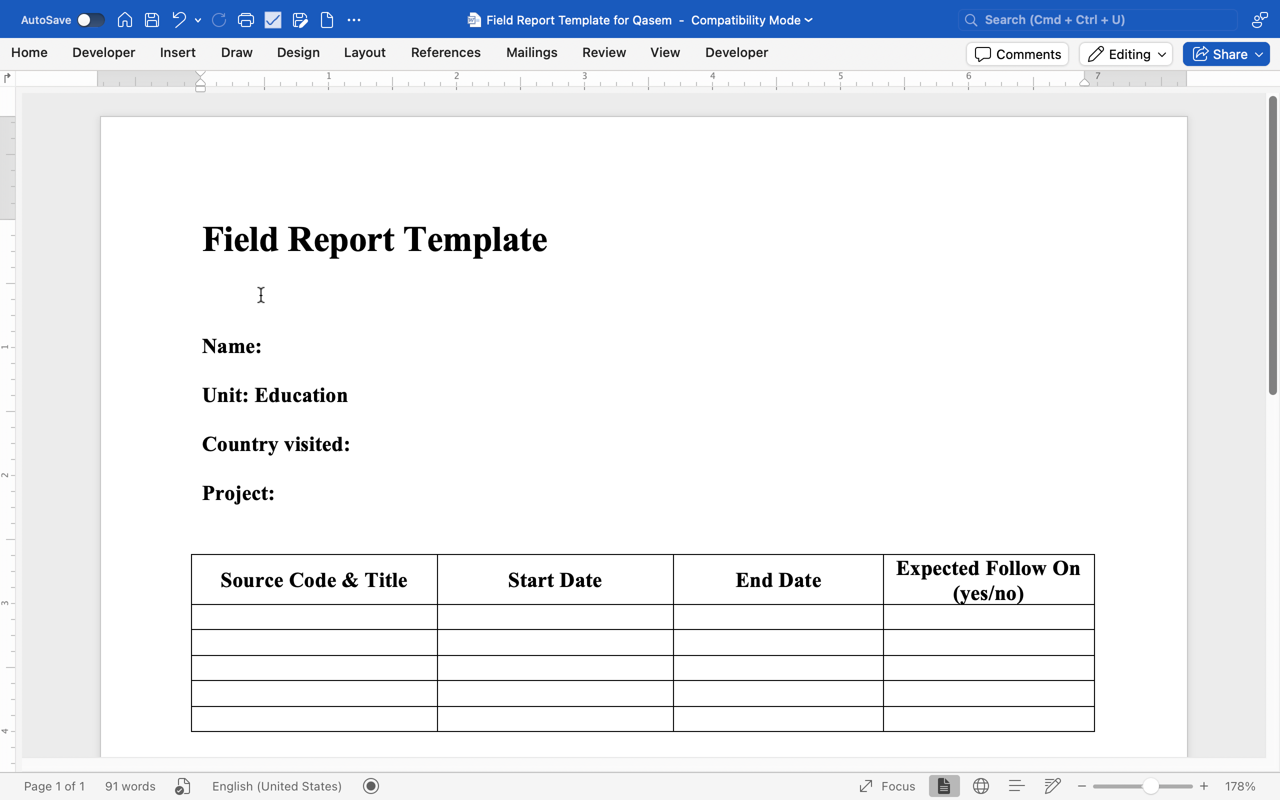 Header Information (Name, Unit, Country Visited)