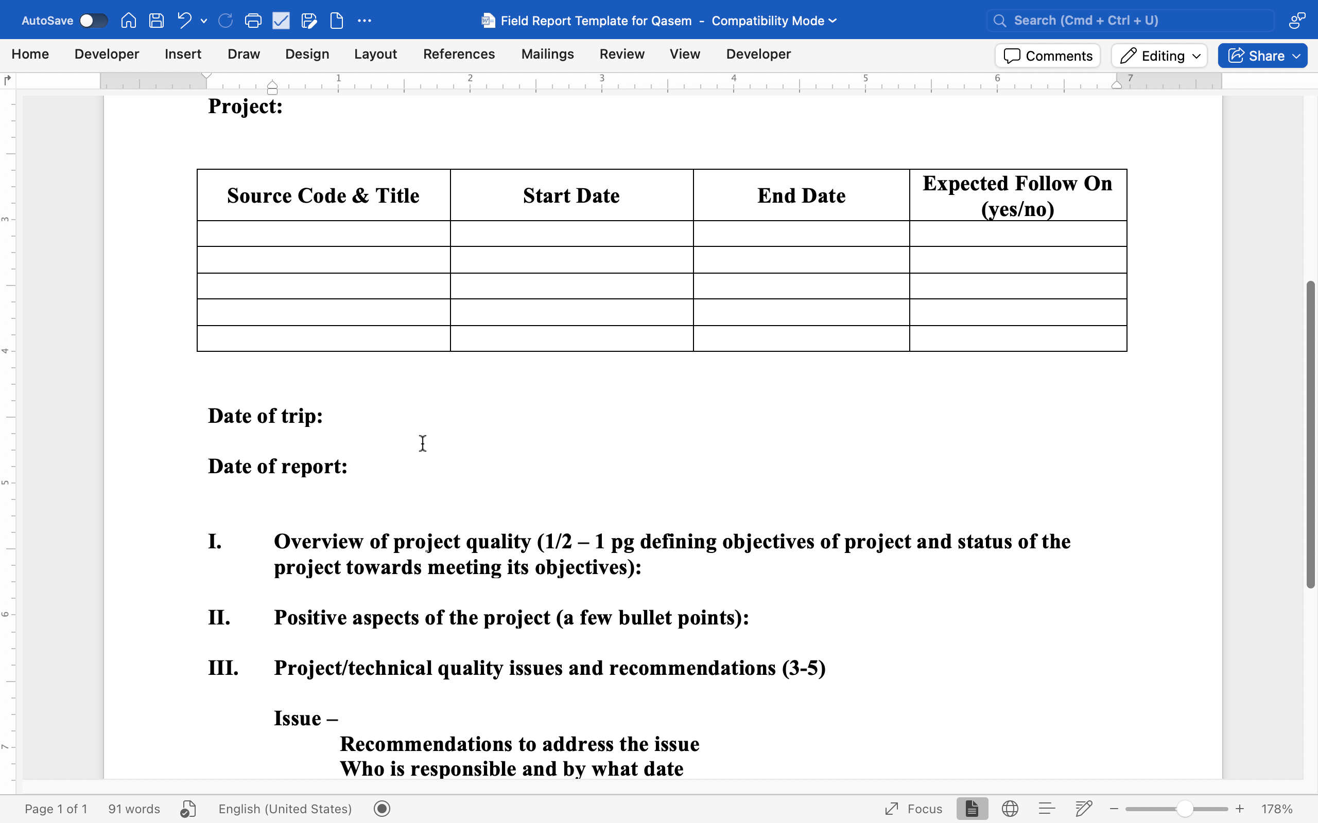 Section III: Project/Technical Quality Issues & Recommendations (Issue, recommendation, responsible party, due date)
