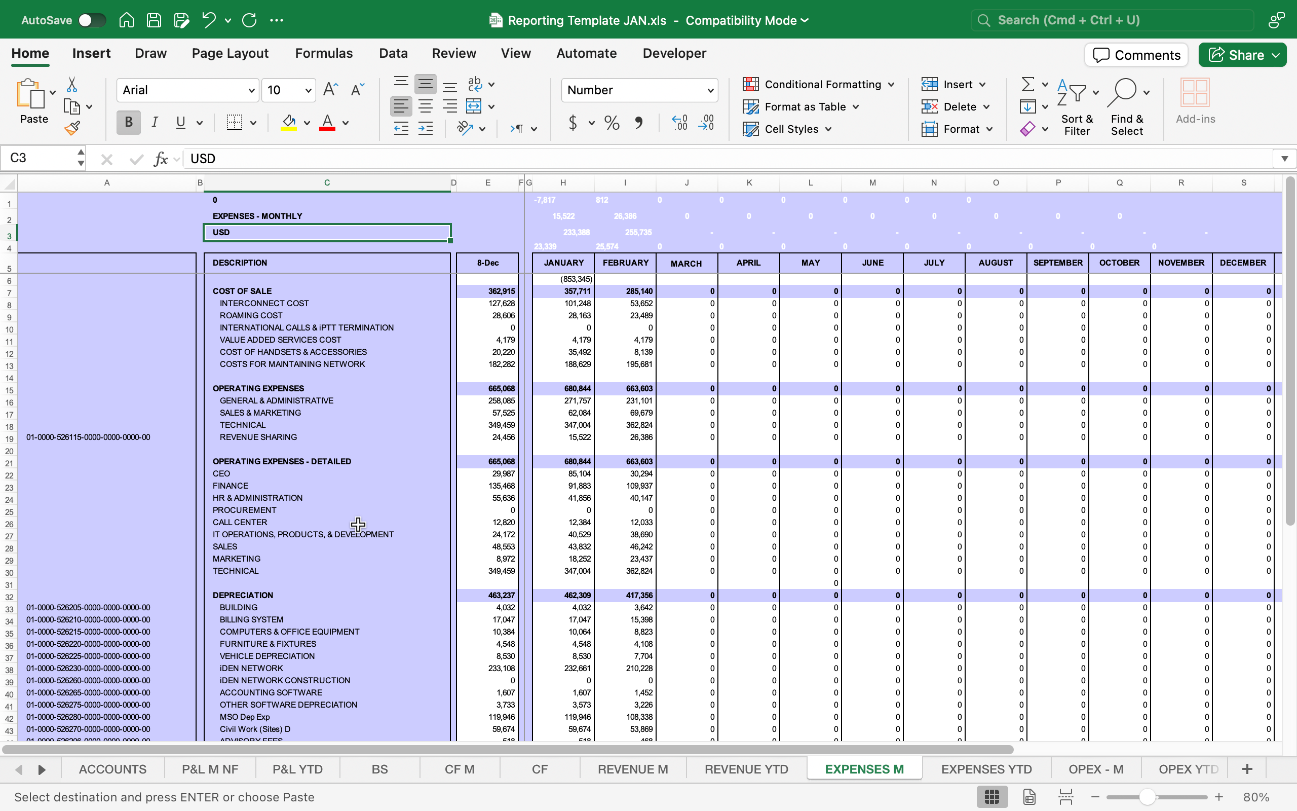 This spreadsheet template is a comprehensive management reporting workbook designed to produce consistent monthly and year-to-date (YTD) financial statements from detailed account-level inputs. It consolidates a chart of accounts and monthly movements into standard reports, Profit & Loss (monthly and YTD), Balance Sheet, and Cash Flow, and then breaks performance down further through dedicated schedules for revenue, expenses, operating expenses (OPEX), and employee benefits, enabling clearer tracking of cost drivers, budget control, and trend analysis across months.