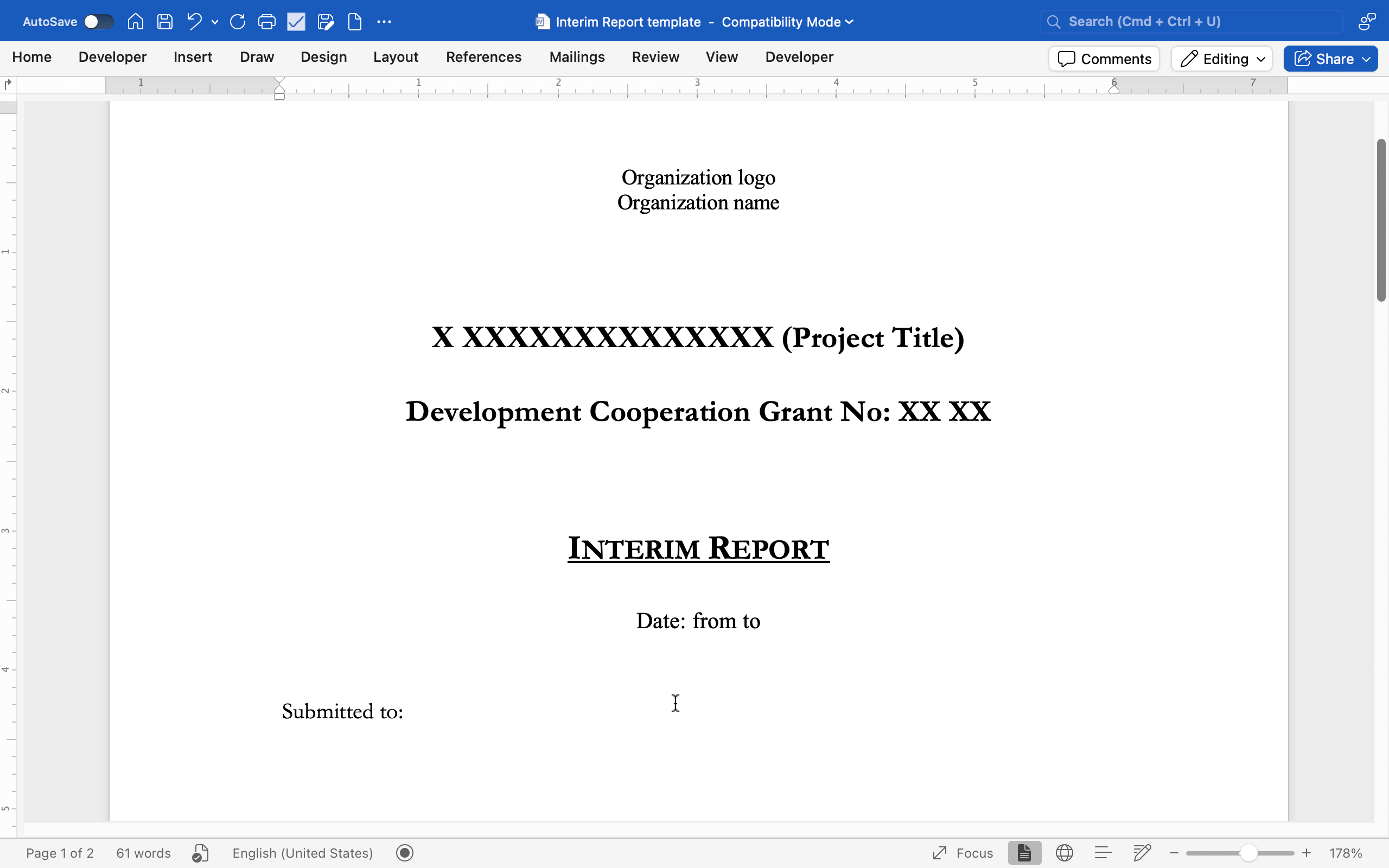 This Interim Report Template provides a simple, donor-facing structure for documenting mid-term progress of a grant-funded project. It starts with a cover page capturing project identification details (project title, grant number, reporting period, submission date, and organizational contact information), then guides the report writer to summarize the project’s purpose, aim, and objectives, and present a clear narrative of implementation progress. It also prompts a results-oriented breakdown of progress by objective, highlights problems encountered during implementation, and documents cross-cutting aspects that affect delivery quality—especially community participation and coordination with other stakeholders—before closing with a concise conclusion.