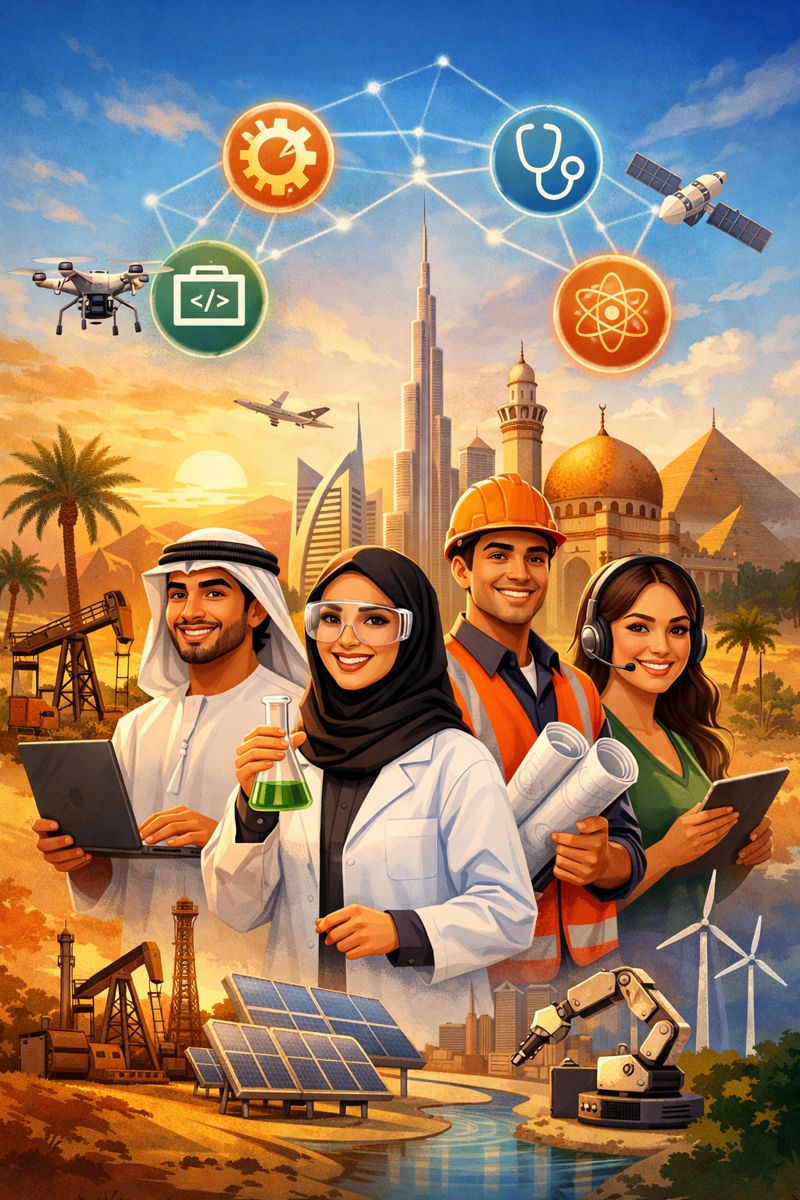 - الصحة والرعاية: التمريض والمهن الصحية المساعدة، وفنيو المختبرات الطبية والتصوير الطبي، وأدوار دعم المرضى، وخدمات رعاية المسنين.