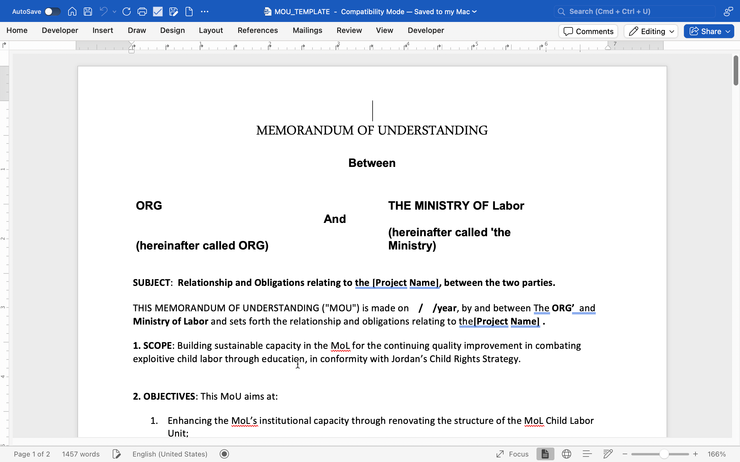 This template provides a structured Memorandum of Understanding (MOU) format that partners can adapt to formalize collaboration, clarify roles, and document commitments. In its first part, it is set up as a partnership MOU (example: between an organization and the Ministry of Labor) for a project focused on strengthening institutional capacity and improving systems (e.g., combating exploitative child labour through education). It guides users to define the scope, objectives, and activities, specify the duration and effective date, list references that govern implementation, and describe mutual responsibilities, resource needs, payment/performance terms, monitoring arrangements, and a termination clause, all to reduce ambiguity and improve accountability during delivery.