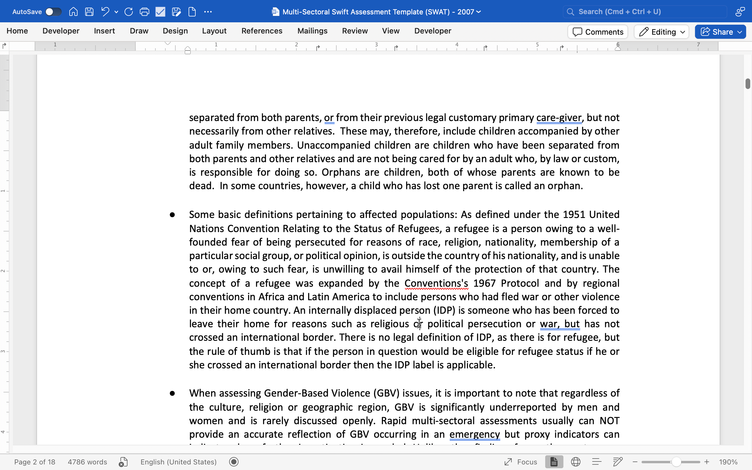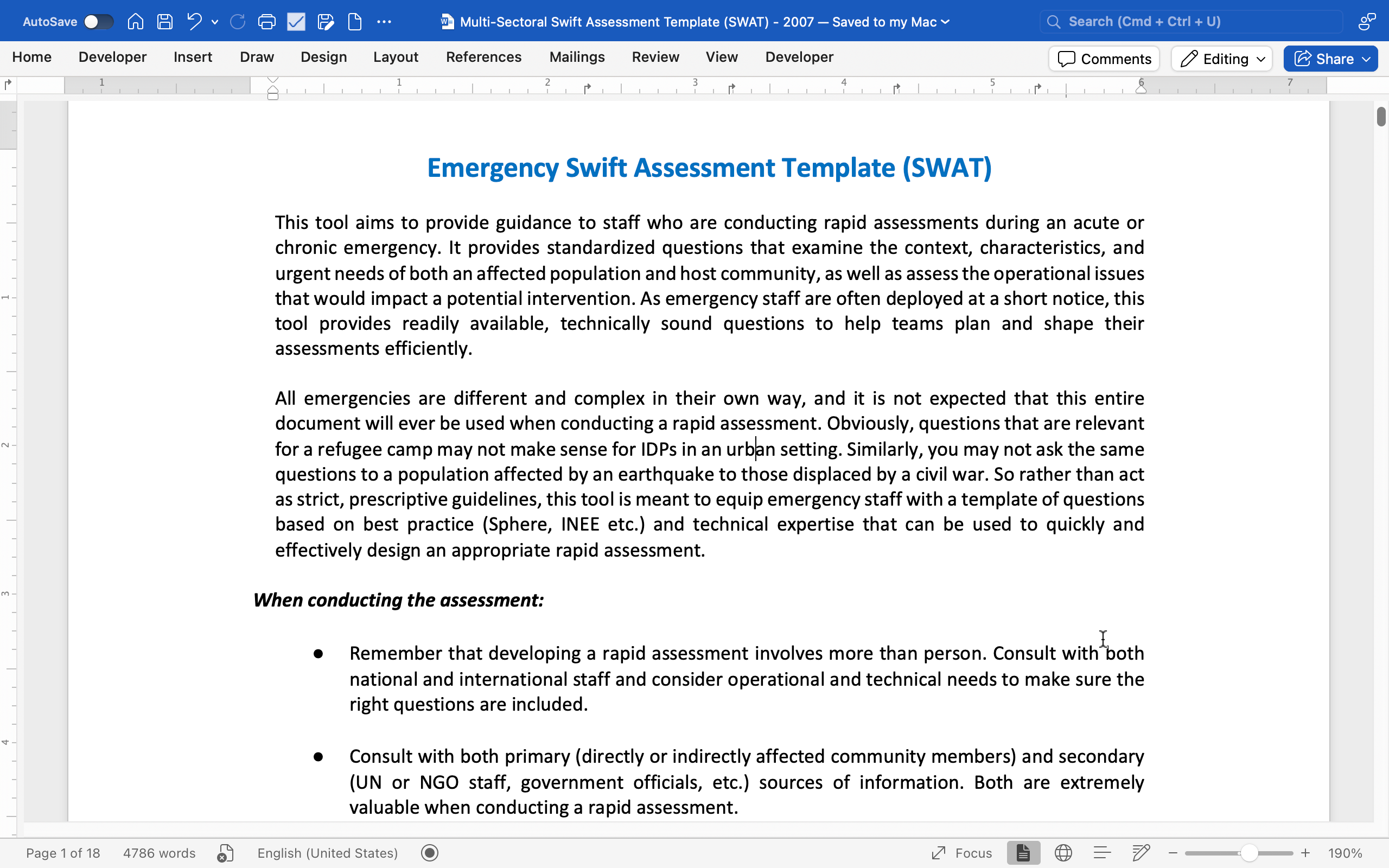This Multi-Sectoral Swift Assessment Template (SWAT) is a streamlined, field-ready questionnaire designed for rapid, early-stage humanitarian assessments to quickly understand context, population conditions, priority needs, and operational feasibility. It combines core “do no harm” and practical guidance with a structured set of prompts to capture (1) operational constraints such as access, communications, security, and coordination; (2) contextual and population information including host-community dynamics, displacement drivers, population size and movements, and self-identified priority needs; and (3) a sector-by-sector scan of urgent needs and gaps across key areas such as child and youth protection, education, GBV, health, environmental health/WASH, shelter, NFIs, and food—so teams can triangulate information, identify immediate risks, and prioritize response actions efficiently.