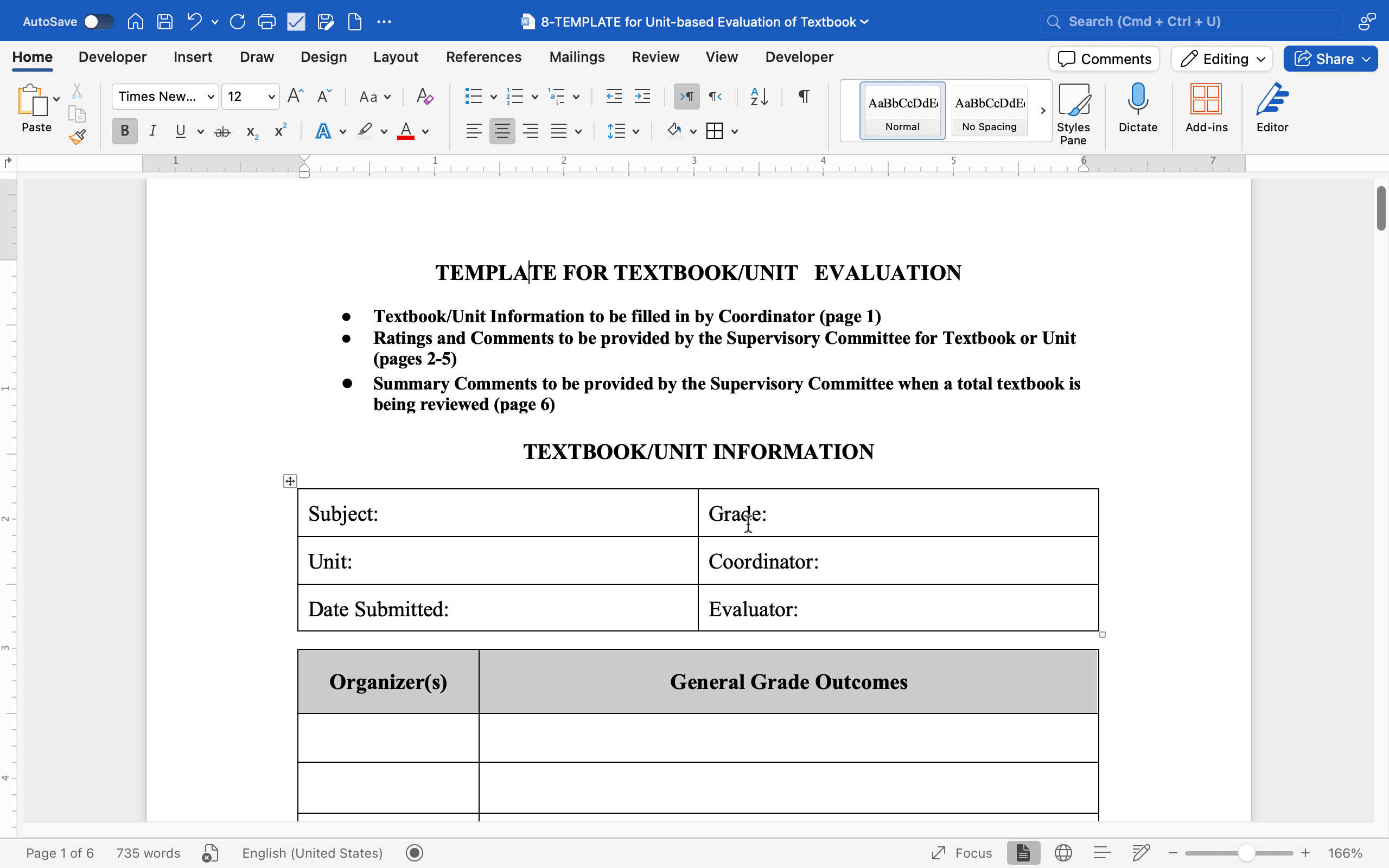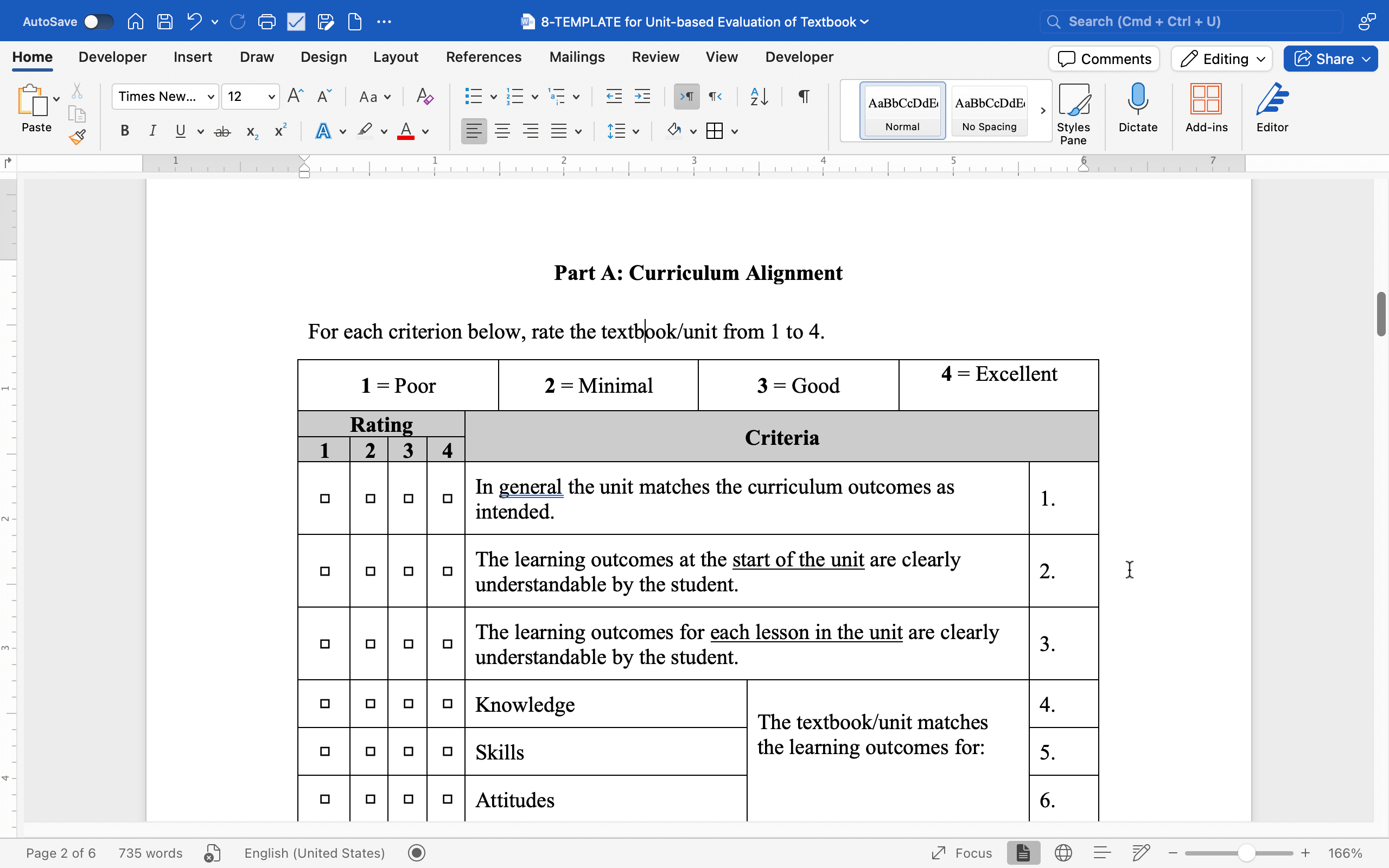 This Unit-based Evaluation of Textbook template is a structured rubric used to review a textbook or a single unit by collecting basic bibliographic details (subject, grade, unit, coordinator, submission date, evaluator) and then guiding a supervisory committee to rate and comment on the quality of the material across four core domains: Curriculum Alignment (fit with intended learning outcomes and reinforcement through activities), Social and Cultural Considerations (consistency with Islamic values, inclusion of persons with disabilities, absence of stereotypes, gender balance, relevance to Jordan, equity, and learner diversity), Instructional Design and Assessment (accuracy, sequencing, real-life examples, problem-solving, group learning, creativity, critical thinking, ICT integration, and assessment approaches and tools), and Technical Design (layout, readability, visuals, navigation, and coordination of text and graphics), with dedicated space for narrative comments—especially where ratings are “Poor” or “Minimal”, and an overall comments section when evaluating the full textbook.